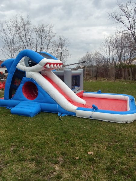 Un super jeu de qualité commerciale avec glissade, sautoir et grand bassin d’eau. Glissez avec le requin!